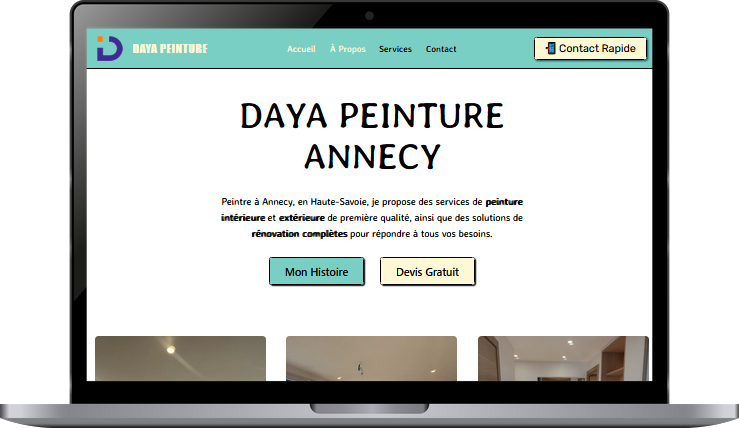 Daya Peinture est une entreprise située à Annecy et Rumilly, spécialisée dans les travaux de peinture intérieure et extérieure. L’objectif de ce projet était de créer un site web simple, efficace, et fonctionnel, qui mette en avant les compétences de l’entreprise tout en facilitant la prise de contact avec ses clients.
